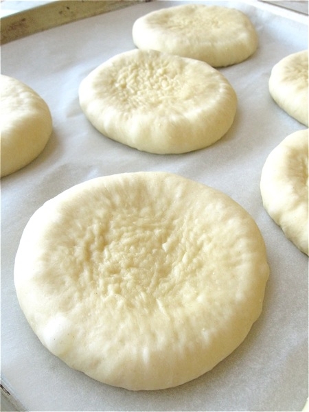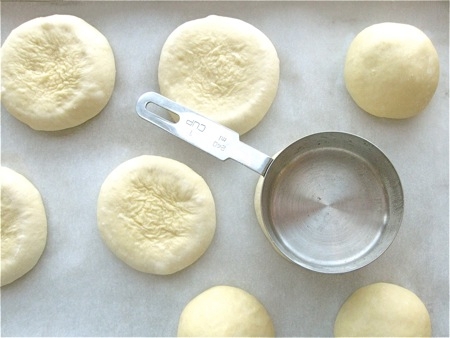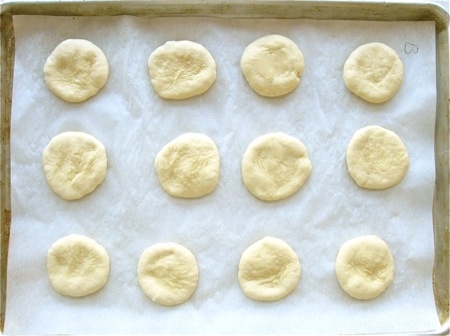 Use the palm of your hand and your fingers to flatten each ball; they should be about 2 1/4" in diameter. They'll shrink back to a smaller size; wait 10 minutes, come back, and flatten them again.
