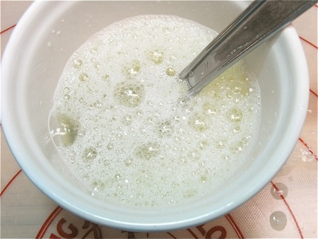 Remember the reserved egg white? Now's the time to add 2 tablespoons cold water, and whisk the mixture to a froth. You're going to paint it on the buns before sprinkling on seeds.