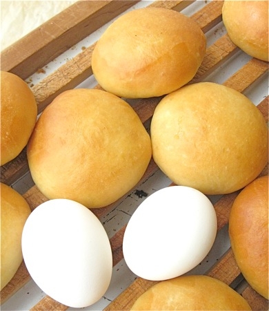 Here are the slider buns with a couple of eggs, for scale; they're about 2 1/2" to 3" in diameter.