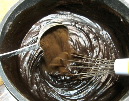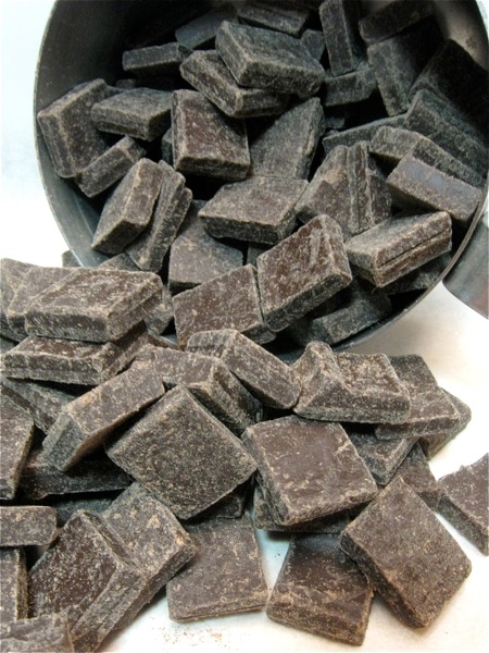 I'm going to use Peter's Burgundy Chunks here, my favorite all-purpose semisweet chocolate. Since the cocoa is unsweetened, I didn't want to go TOO dark with the solid chocolate; and Peter's has really nice flavor, IMHO.