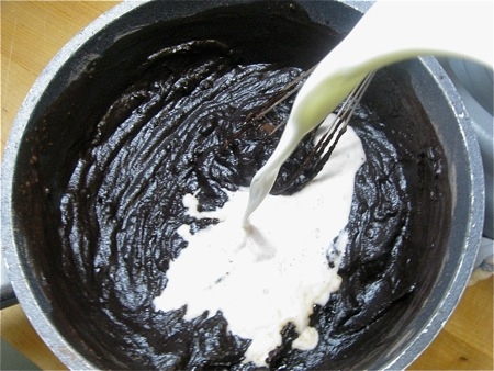 Whisk in 2 cups (454g) whole milk. That's right, this ice cream has no cream; it's mostly chocolate, which is why it's so delectably dark.