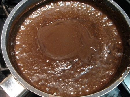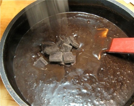 Remove the pan from the heat, and add 1 cup chopped semisweet or bittersweet chocolate, or chocolate chips; those are the aforementioned Burgundy chunks I'm stirring in. Stir until the chocolate melts completely.