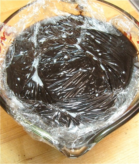 Lay a piece of plastic wrap on the surface of the chocolate, again to prevent a skin from forming, and refrigerate until it's well chilled; overnight is good.
