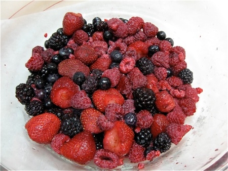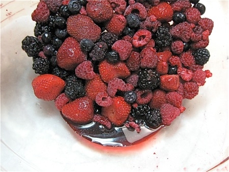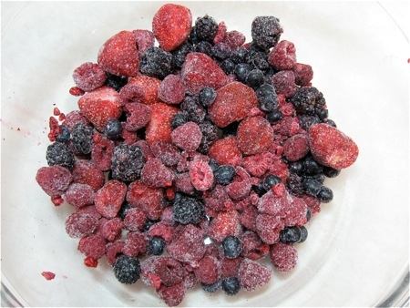 Assuming you're using frozen berries, place 7 to 8 cups (about 765g) in a microwave-safe bowl. If you're using store-bought frozen berries, 2 bags should be sufficient.