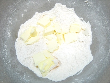 Dice 4 tablespoons (57g) cold butter into cubes or cut into small pats, and add it to the dry ingredients.