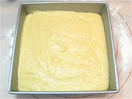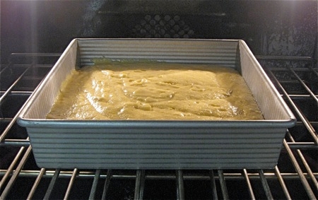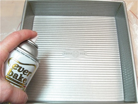 Lightly grease a 9" square pan. Make sure your pan spray isn't one that includes flour.