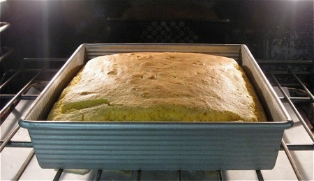 Spoon the batter into the prepared pan. Use your wet fingers to gently smooth the surface. Let the cornbread sit for 10 minutes.