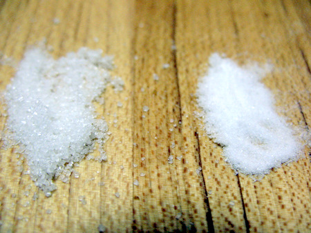 On the left, you see regular table sugar, on the right Baker's superfine sugar. Normally we think of granulated sugar as very tiny grains, but compared to superfine sugar, granulated looks enormous. In a cookie or brownie, the difference would never be noticed, as the sugar is dissolved and blended into the batter. In meringue, though, the size of the sugar grain can make a huge difference.