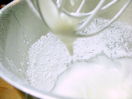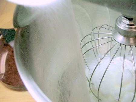 With the machine still running, slowly pour in 1 cup (198g) superfine sugar mixed with 1 tablespoon cornstarch. Aim for the sweet spot between the whisk and the side of the bowl to reduce the amount of sugar that's spun off to the side. Once the sugar is all in, blend in 1 teaspoon lemon juice by hand.