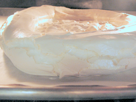 Place the pan in the 200°F oven and bake for 1 hour. The meringue will billow up beautifully. Don't worry about cracks; they're normal.