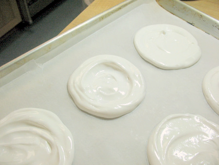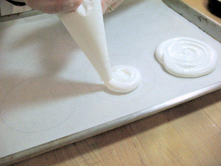 When making smaller discs, it's easier to pipe your meringue onto your circles. A disposable piping bag or even a zip-top bag with a corner cut off makes this a snap to do.