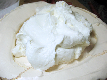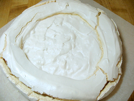 To fill the pavlova, whip up some sweetened whipped cream and mound it in the center of the disc. It should fill the center and slightly over the inner edge of the ring, but should not overflow onto the sides. About 1 1/2 cups (340g) of heavy cream should do it.