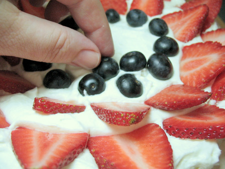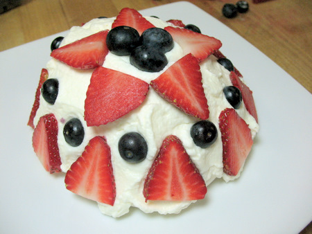 You can toss your fresh fruits together and pile that on the cream, or you can arrange patterns. With July 4 around the corner, I chose red and blue berries.