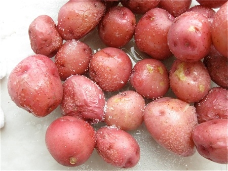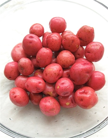 Prepare the potatoes while the dough is chilling, or anytime before it's ready to be topped. I love tiny new red potatoes; I found 1 3/4 pounds, about 35 small potatoes, is perfect for this pizza – and won't drain your wallet too heavily.