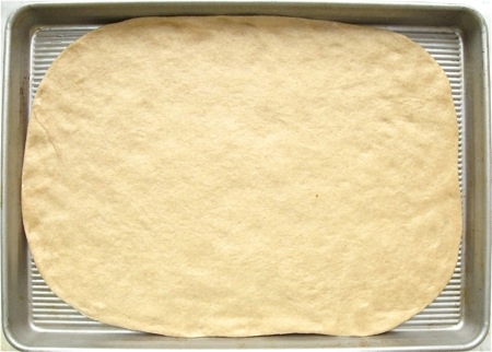 Pat the dough into a lightly greased half-sheet pan (18" x 13") that's been drizzled with olive oil. This will make a medium-crust, Sicilian-style pizza, one that's thick enough to undergo the long bake at a high temperature necessary to optimize its antioxidants.