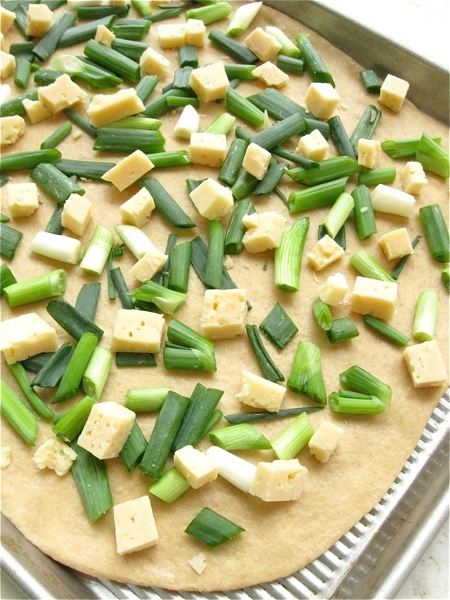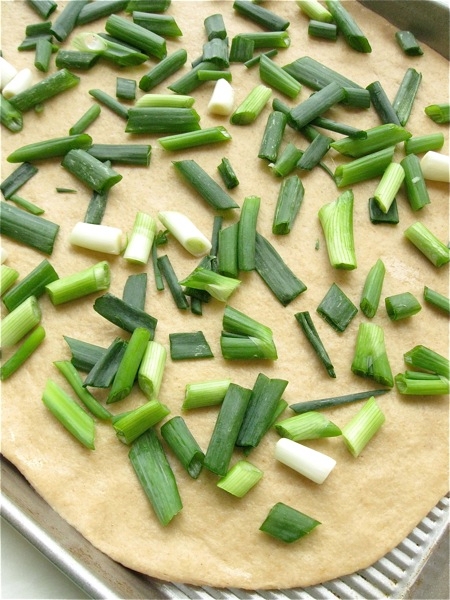 Clean 2 bunches of scallions, and chop in 1" to 2" pieces, both white and green parts. Spread them over the crust.