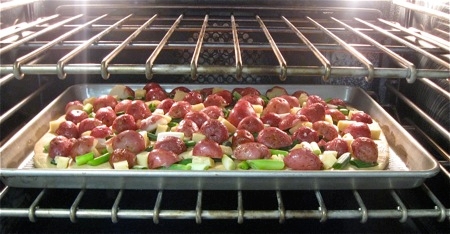 As I said, if potatoes don't float your boat, substitute your favorite toppings. If you're going with shredded cheese, I'd suggest baking the pizza on the bottom rack of the oven without its cheese; then adding the cheese just before transferring to the top rack. This will keep the cheese from burning and/or becoming rubbery and overcooked.