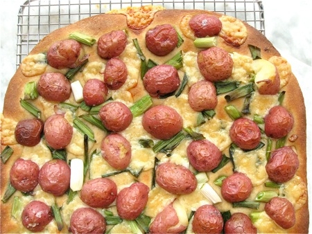 Here's one more look at not only the potatoes, cheese, and scallions; but that nicely risen, tasty, nutritious 100% whole wheat crust.