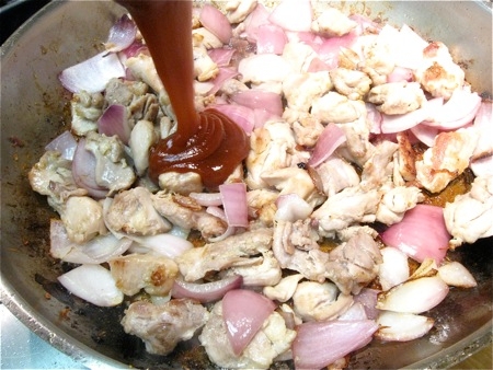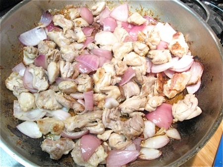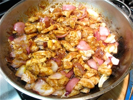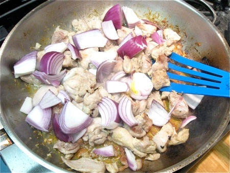 For a pleasantly crisp touch, here's where you use the other red onion. Peel, cut into chunks, and scatter top the chicken mixture.