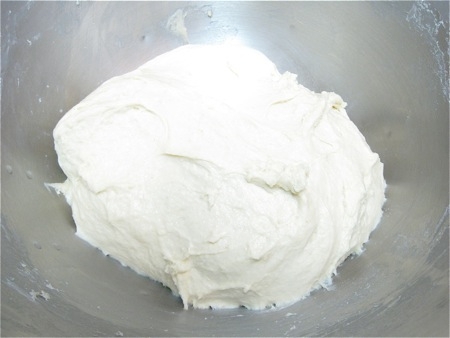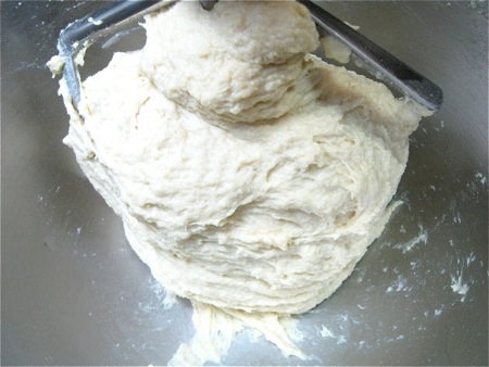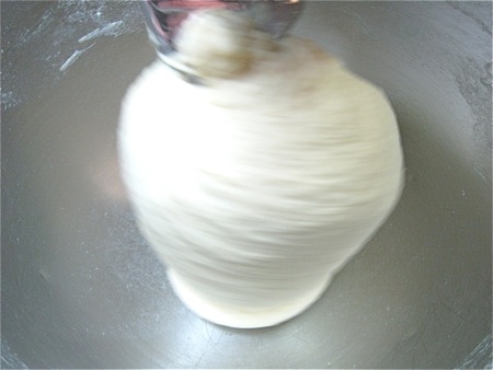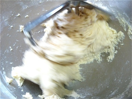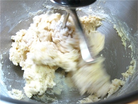 Beat at high speed of your electric mixer, continuing to use the beater blade, for 2 minutes. See how the dough is beginning to smooth out? Time to switch to the dough hook.