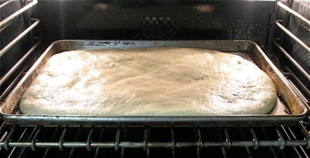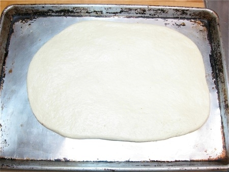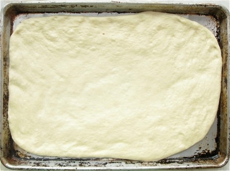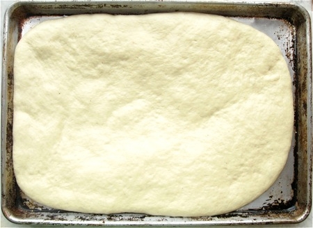Place the dough in a lightly greased pan - the aforementioned half-sheet pan is a good choice, size-wise.