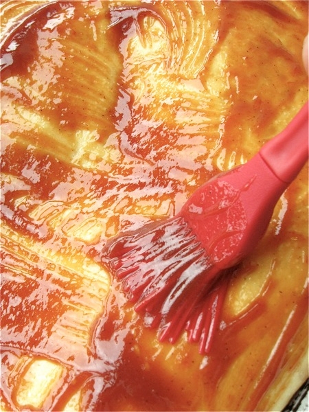 When you're ready for pizza, spread the partially baked crust with about 1 cup barbecue sauce; more or less, to taste.
