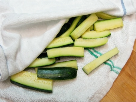 Place the zucchini sticks in a colander over a bowl, and sprinkle with 1 tablespoon of salt. Let them drain for 1 hour or longer.