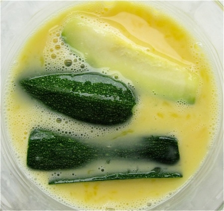 Beat 2 large eggs; or pour 1/2 cup (113g) egg substitute into a dish. You're going to dip each zucchini stick in the egg...