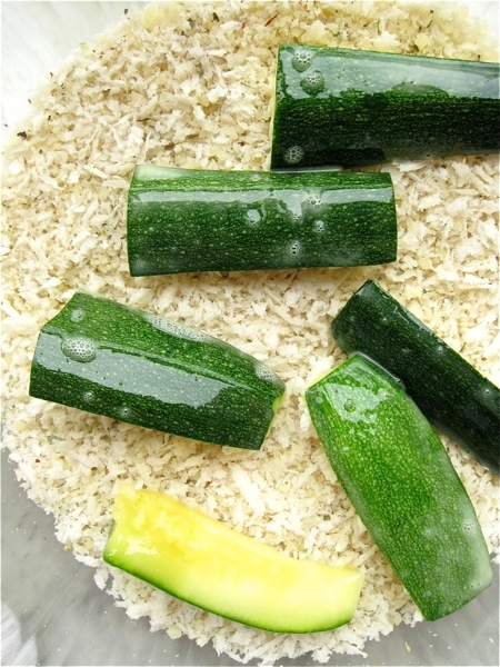 Cut each zucchini into 3" sticks about the diameter of your finger. Cutting each zuke into 9 sticks lengthwise, then cutting into 3" lengths, works well.