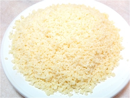 First, grate 1 cup (113g) of cheese. This is Parmesan; I think it stands up well to the remaining ingredients in these cakes. For best flavor, choose a stronger (Parmesan, sharp cheddar) rather than milder (Monterey Jack, mozzarella) cheese.