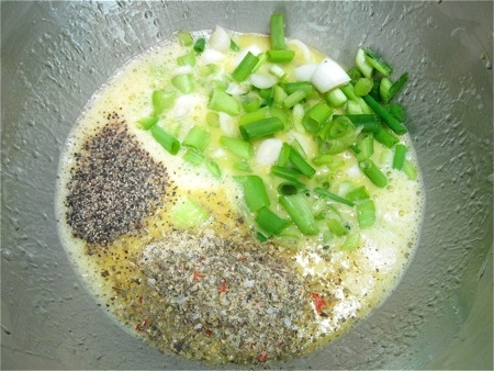 Put the cheese and eggs in a bowl. Add the vegetables, and stir to combine.