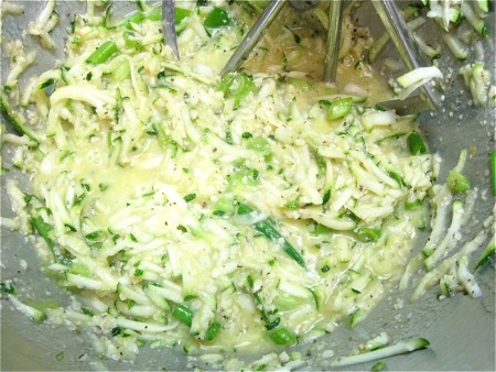 "Fry grated zucchini – Ma used 2 zucchini and 1 summer squash – and chopped onion with olive oil in a spider [cast iron pan]. Put eggs and Parmesan in a bowl. When the zucchini and onion is cooked, turn it out of the pan into the bowl with the eggs and cheese; it should come right out without sticking.
