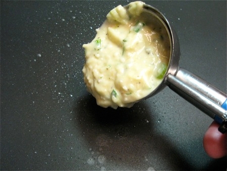Drop the batter by 1/4-cupfuls onto the hot, lightly greased griddle. A muffin scoop is the ideal tool here.