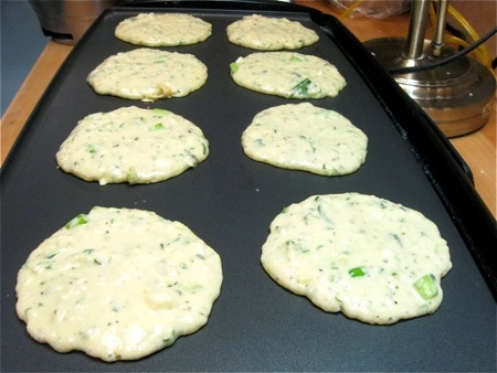 Now, before you plop a whole lineup of cakes onto the griddle, fry one cake first; that'll let you get your griddle temperature down without burning or under-cooking half your recipe.