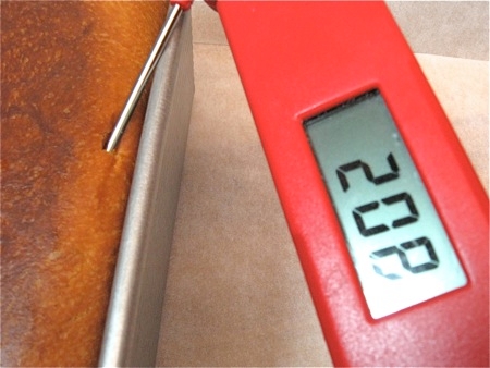 Remove the pan from the oven, remove the lid, and test the bread; it should be golden brown, and an instant-read thermometer inserted into the center should read 205°F to 210°F. If the loaf isn't done, put the lid back on, and return it to the oven for several minutes to finish baking.