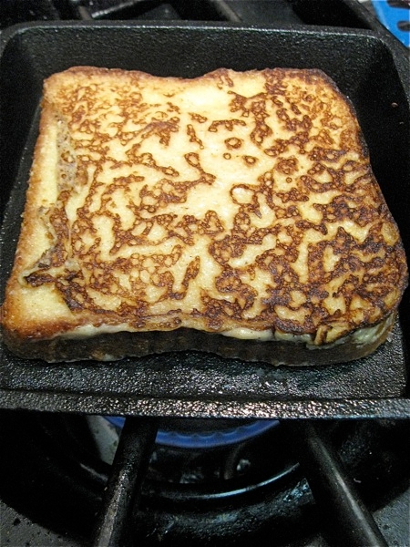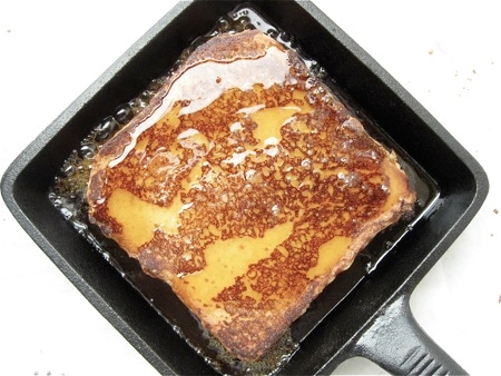 Preheat a griddle, a skillet or, as I'm doing above, a single-serve skillet. Cook the French toast for 2 to 3 minutes on the first side, or until it's golden brown; adjust the heat so it's not cooking too slowly or too quickly.