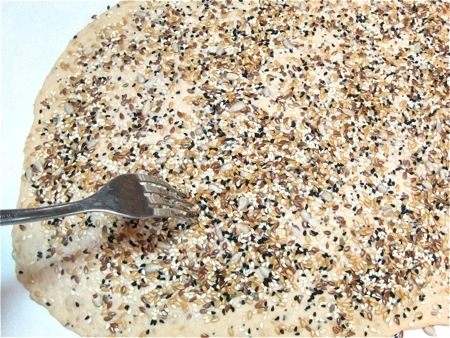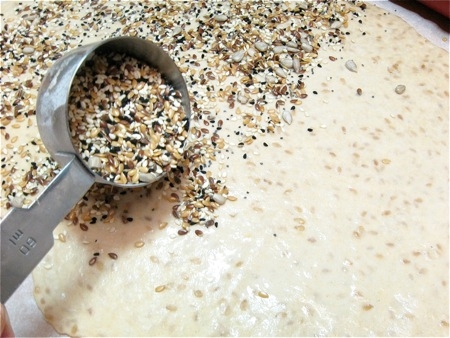Except that I went ahead and tried my own version, using our artisan bread topping: flax, toasted sesame, black caraway, midget sunflower, poppy, and anise seeds. Plus golden flax seeds, just because I like their look and taste.