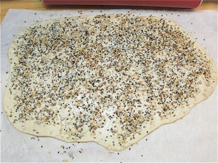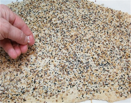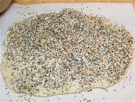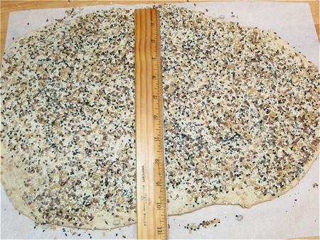 The dough is now covered with seeds on both sides. And with all the rolling, it'll probably have stretched to about 15" x 10"; though if not, don't worry about it.