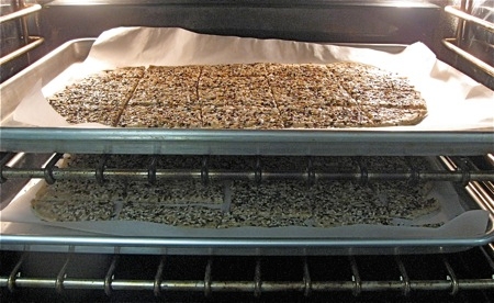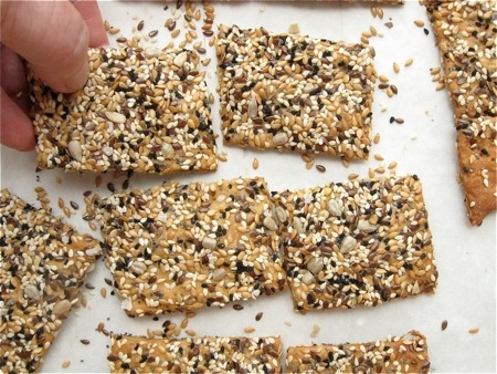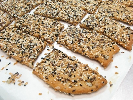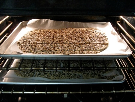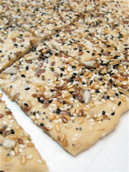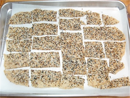 They worked on the cracker itself: too thick, too thin, and too hard eventually became just right. And the toppings: sunflower, flax, and sesame were the perfect combo.