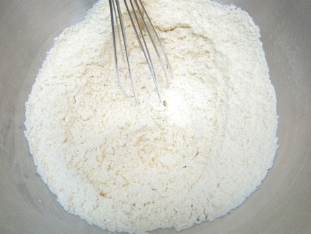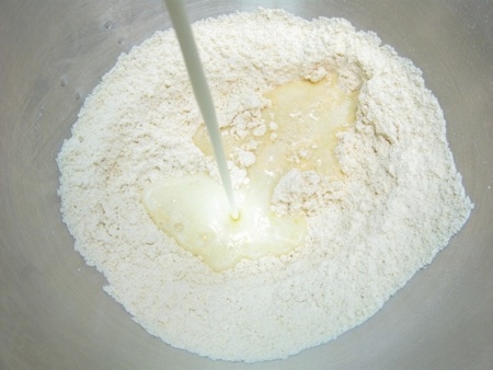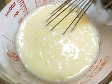 I used vegetable oil rather than butter here; I find hot melted butter combined with cold milk and eggs turns into butter globules. And, since I didn't warm my milk and eggs to room temperature (ALWAYS in a hurry), I subbed the oil.