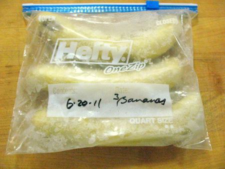 Grab some very ripe bananas from the counter or the freezer. The freezer?! Yes, the freezer. Bananas freeze very well in or out of their peels, so toss 'em in the chiller instead of the trash next time they start to ripen before you can use them all. You'll need one of medium size, or about 3/4 cup total banana.