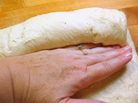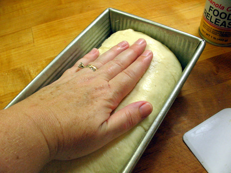 Place the dough log seam-side down in the pan and press it firmly with your hand. You need to dough to fill the corners of the pan now, as it rises it tends to go up, not out.