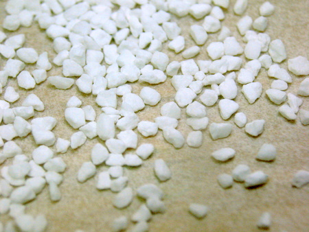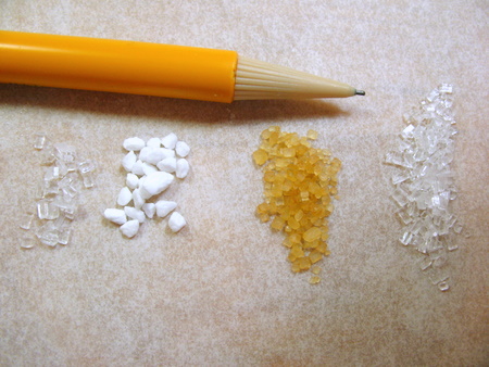 Now that we've looked at each sugar up close, here's how they compare side by side. The pencil is for scale; you can see that while each is larger than table sugar, they have their own unique sizes and shapes. The sugars are still in their original order, so the sugar on the far left is a coarse white and the sugar on the far right is the sparkling white. When viewed side by side it is harder to tell them apart, but when viewed next to the other sugars, it is a little easier to see the different in clarity and sparkle.
