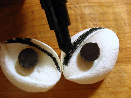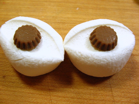 Turn the marshmallow sticky side up and press two "eyes" into the center. I've used mini peanut butter cups here, but chocolate chips and M&Ms would work well too. If you want to go all the way, try cinnamon red hots for a true horror movie look.