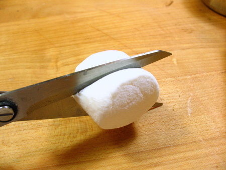 Let's start by cutting a large marshmallow in half with kitchen scissors. A spritz of cooking spray on your scissors will help with any sticking.
