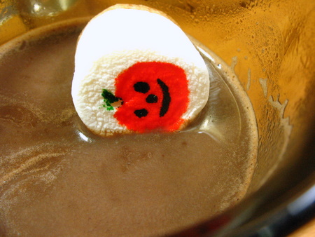 If having your drink stare back at you isn't your cup of cocoa, try adding some decorated marshmallows to your cup. Coloring on marshmallows is a snap with Foodoodlers. I once made colored marshmallows on a stick for a bake sale, and they were a hit!