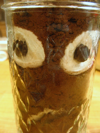 Having a Halloween party? Haunted Hot Chocolate would make a great party favor. Fill your jar 2/3 full with the hot chocolate mix, then press two eyes up against the glass. Getting them to stick a little is helpful when you fill the rest of the jar. Use a skewer to push some mix between the eyes to fill in. Top with a fun Halloween fabric print, or even fake fur for all out fun.