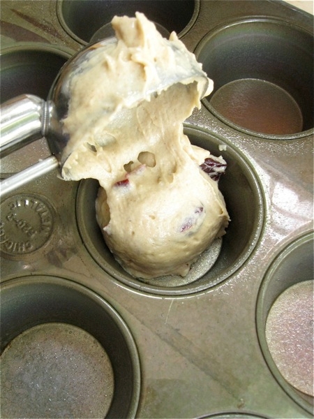 Divide the batter among the wells of the muffin tin, filling each one about 3/4 full. A muffin scoop works well here.