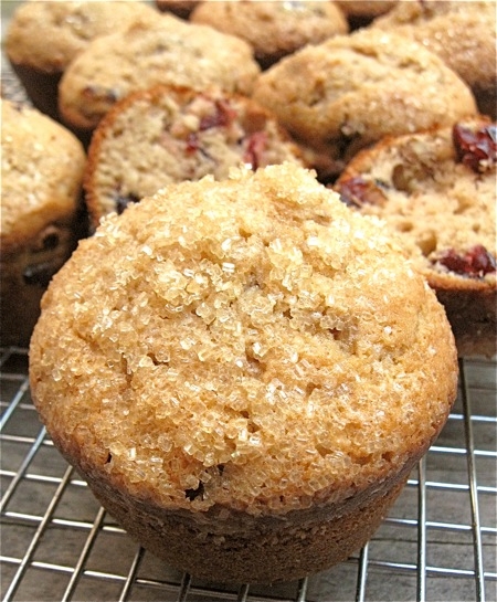 To make these muffins without whole wheat flour, simply substitute 1 cup King Arthur Unbleached All-Purpose Flour for the cup of whole wheat flour. I mimicked the Doughnut Muffins finish, too, by dipping the muffins in melted butter (2 tablespoons for the batch should do it), and granulated sugar (about 1/4 cup; no cinnamon. Remember, I don't want any assertive flavors fighting it out with the cranberries and nuts).