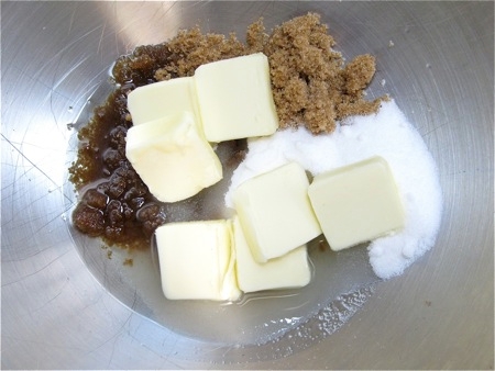 3 tablespoons each vegetable oil and butter? Well, without the Doughnut Muffins' butter topping, perhaps I'd best keep those at full strength, too. Besides, 1/4 cup is less fussy to measure.